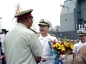被稱為“神州第一艦”的導彈驅(qū)逐艦深圳號,承擔了引導美艦進港的任務。22日早些時候,深圳艦與美海軍艦艇編隊在預定地點會合,引導美艦進入中國十大港口之一的湛江港。深圳艦按照中國海軍規(guī)定懸掛“WTC”英文字母國際旗語,表示“歡迎到訪中國”。接著,掛有美國國旗和中國國旗的“考彭斯”號和“范德格里夫特”號在深圳艦之后慢慢進入了湛江港。