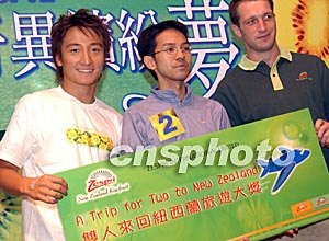 香港歌手方力申,九月二十三日在香港舉行的“ZESPRI奇異黃金夢(mèng)慶祝會(huì)”上主持問(wèn)答游戲。圖為一名參賽者獲得雙人往返紐西蘭旅游大獎(jiǎng)。中新社記者:錢興強(qiáng)