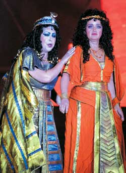 讓人驚奇的是,這個(gè)古老的埃及故事的結(jié)局和中國(guó)古老的愛情故事《梁祝》做了非常巧妙的嫁接。即將被處死的拉達(dá)梅斯走進(jìn)墓穴,而美麗的阿依達(dá)也跟隨他一同走向歸宿。墓穴緩緩閉合,全場(chǎng)燈光瞬間熄滅,幾百支火把一起點(diǎn)亮,此時(shí)夜空中兩只巨大的蝴蝶和幾千只美麗的小蝴蝶翩翩起舞,而主人公幻化的“靈魂”從舞臺(tái)西側(cè)飛向東側(cè)。美麗的結(jié)尾,將成為人們永久的記憶。(張學(xué)軍)