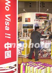 日本人赴中國短期旅行免簽證,成為招徠日本游客的新手段,十月三日在日本橫濱開幕的世界旅行博覽會(huì)上,中國展臺(tái)豎起了免簽證的宣傳牌。作者:王健