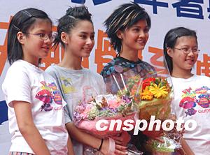 香港樂(lè)壇人氣組合TWINS,十月四日出席在香港理工大學(xué)舉辦的青少年體育嘉年華活動(dòng),兩名理大學(xué)生向TWINS獻(xiàn)花。中新社記者:錢(qián)興強(qiáng)