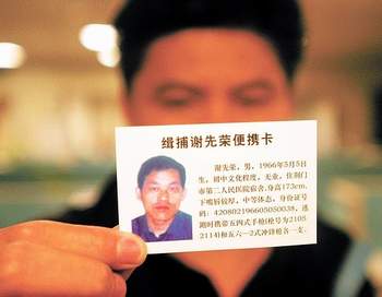 這張卡片名為“緝捕謝先榮便攜卡”,正面左邊為謝先榮的彩色頭像,右邊則是簡介:謝先榮,男,1966年5月5日生,初中文化程度,無業(yè),住荊門市第二人民醫(yī)院宿舍,身高173厘米,下嘴唇較厚,中等體態(tài),身份證號碼:420802196605050038,逃跑時攜帶五四式手槍和五六-2式?jīng)_鋒槍各一支。