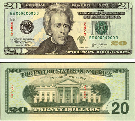 新版美鈔保持了傳統美鈔的外貌,尺寸亦沒有改變,鈔票的正反面也仍然是安德魯·杰克遜的圖像和白宮的圖案,只是色彩有所增強。新版二十美元是美國近代史上首次用多種顏色而非單一綠色印刷的鈔票,除了傳統的綠色以外,鈔票底色是桃色,上有藍色的鷹形圖案和銅色數字。
