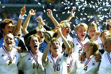 北京時(shí)間今天凌晨3時(shí)許結(jié)束的第四屆女足世界杯決賽中,德國(guó)隊(duì)與瑞典隊(duì)在90分鐘的比賽中戰(zhàn)成了1-1平。在加時(shí)賽中,德國(guó)隊(duì)?wèi){借著后衛(wèi)金策爾的一粒金球讓瑞典隊(duì)飲恨美利堅(jiān),他們也因此成為該項(xiàng)賽事的新科狀元。德國(guó)隊(duì)頭號(hào)射手普林茨奪取了金靴獎(jiǎng)和金球獎(jiǎng)兩項(xiàng)大獎(jiǎng)。圖為德國(guó)隊(duì)員棒杯歡呼。