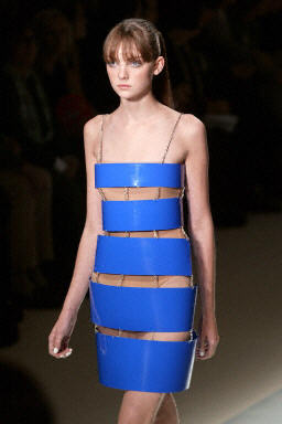在巴黎2004春夏女裝展上,模特展示了設(shè)計(jì)師Paco Rabanne的另類新作。