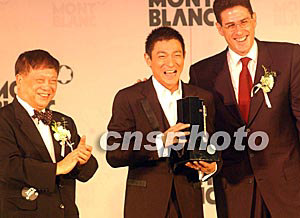 2003年萬(wàn)寶龍國(guó)際藝術(shù)贊助大獎(jiǎng)十月十七日在香港舉行頒獎(jiǎng)儀式,圖為萬(wàn)寶龍亞太區(qū)主席詹兆安和萬(wàn)寶龍文化基金會(huì)香港顧問(wèn)盧景文為劉德華頒發(fā)大獎(jiǎng)。中新社記者:錢(qián)興強(qiáng)