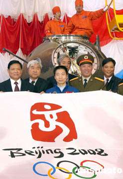 十月十八日,中國神舟五號載人飛船回收艙搭載物品開艙儀式在中國航天科技集團(tuán)公司北京空間技術(shù)研制試驗中心舉行。中國首位航天員楊利偉(中)、2008年北京奧運會奧組委主席劉淇(左一)等共同展示太空“乘客”——2008年北京奧運會會徽旗幟。中新社記者:張煒