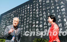 新整修后的王羲之故居矗立一座高大的字碑,被尊稱為天下第一行書的《蘭亭序》篆刻其上,一位參加書圣文化藝術節(jié)的天津書法愛好者,激動地向參觀者訴說自己對王羲之書法的崇拜。作者:王麗南