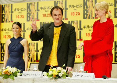 10月19日,美國導(dǎo)演昆汀·塔倫蒂諾(中)、好萊塢著名影星烏瑪·瑟曼(右)和劉玉玲在日本東京出席最新動作片《殺死比爾》的新聞發(fā)布會。該片由塔倫蒂諾執(zhí)導(dǎo),瑟曼、劉玉玲主演,將于10月25日在日本公映。
