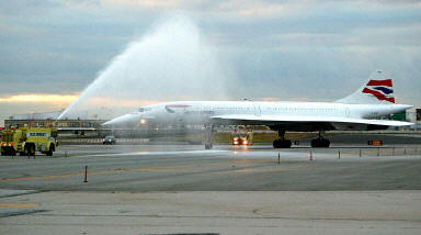 當(dāng)這架“協(xié)和式”以其特有的轟鳴聲降落在肯尼迪機(jī)場(chǎng)時(shí),機(jī)場(chǎng)的消防車噴出水柱,以示歡迎。飛機(jī)的駕駛員從駕駛艙的窗戶伸出一面英國國旗,他還在把飛機(jī)開往停機(jī)樓的過程中不斷向機(jī)場(chǎng)地勤人員招手致意。