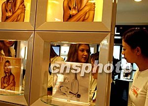 參加中國新絲路世界模特大賽的俄羅斯小姐,十月二十八日逛杭州大廈商場,采購法國名牌香水。中新社記者:賈國榮