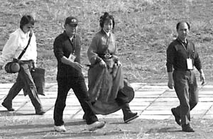 停車處與拍攝的大殿有幾百米距離,劉曉慶神態(tài)自若地與身邊人有說有笑。她看上去只有35歲上下,扮相頗像當年的“武媚娘”。不少游客從她對面走過時,都沒認出她就是劉曉慶。兩名專門從東陽市保安服務公司聘請來的保鏢也無事可做,一路上幫著她的化妝師、助理拎包。直到走到大殿,劉曉慶發(fā)現(xiàn)早早埋伏的記者們舉著“長槍短炮”,立刻變了臉色。保鏢和助理立刻高舉雙手阻止拍照。劉曉慶進殿后兩名保鏢把守住前后大門。