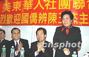 今天早晨,陳玉杰一行七人首先到紐約華埠拜訪美東華人社團(tuán)聯(lián)合總會(huì),雖然只是臨時(shí)會(huì)所,但陳玉杰為能親臨僑團(tuán)感到高興。由于“非典”原因,今年一月出任國(guó)僑辦主任的陳玉杰上任十一個(gè)月來(lái)一直未能到海外與僑胞見面,昨天下午抵達(dá)紐約的陳玉杰每次見到僑胞都為此致歉。如今在海外僑團(tuán)的會(huì)所里,面對(duì)親切的僑胞,陳玉杰說自己表個(gè)態(tài):將竭盡全力為僑服務(wù)。