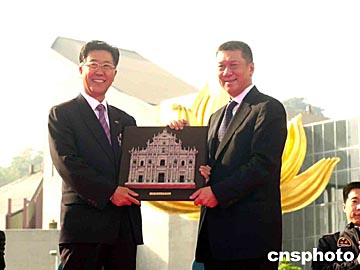 澳門特區(qū)行政長官何厚鏵在儀式上向胡世祥贈送紀(jì)念品。中新社記者:李剛