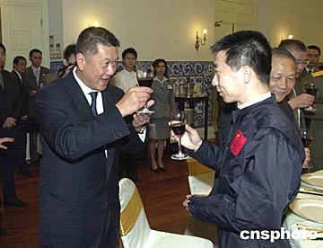 澳門特區(qū)政府五日在政府總部舉行歡迎晚宴,歡迎國家首飛航天員楊利偉和中國載人航天代表團訪澳,圖為行政長官何厚鏵在歡迎晚宴上向楊利偉祝酒。中新社記者:李剛