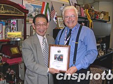 美西時間十一月十三日,中國駐舊金山總領事王云翔赴圣塔克拉拉郡政府辭行,拜會郡議員麥克修。王云翔任中國駐舊金山總領事四年。圖為麥克修議員(右)向王云翔(左)贈送紀念獎牌,對他即將離任深表惋惜。作者:洪磊