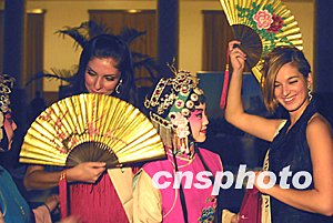 巴西小姐(左二)和葡萄牙小姐(右一)對(duì)中國京劇花旦演出的折扇情有獨(dú)鐘。中新社記者:廖文靜