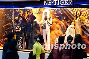 北京東方新天地內(nèi)一家經(jīng)營皮草服飾的商家二十九日以真人模特在櫥窗內(nèi)展示,吸引眾多過往顧客的目光。中新社記者:毛建軍