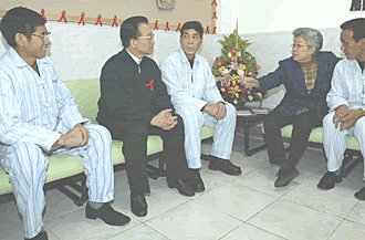上午十時(shí)三十分,溫家寶和國務(wù)院副總理吳儀在中共北京市委書記劉淇,北京市代市長王岐山陪同下,來到北京市地壇醫(yī)院。這所醫(yī)院是目前中國內(nèi)地唯一擁有艾滋病藥物研究資格的國家級(jí)臨床基地,至今已診治六百余例艾滋病患者。
