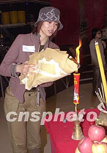 歌星梁詠琪12月5日在香港出席香港將軍澳電視城出席《第十五屆CASH流行曲創(chuàng)作大賽》彩排及拜神儀式,圖為梁詠琪在拜神儀式上化緣,祈求6日晚在大賽中有優(yōu)異演出及獲獎(jiǎng)。中新社記者:鄧慶樂