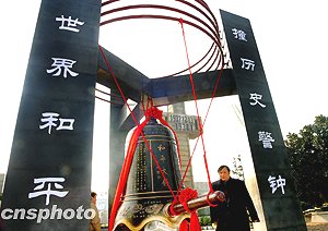 中新社南京十二月十一日電(記者 陳光明)今天,為悼念南京大屠殺同胞遇難六十六周年而鑄造的“和平大鐘”在南京江東門侵華日軍南京大屠殺遇難同胞紀(jì)念館安裝完畢。明天起,“悼念南京大屠殺三十萬同胞遇難六十六周年儀式暨南京國際和平日集會(huì)”系列活動(dòng)將陸續(xù)舉行。