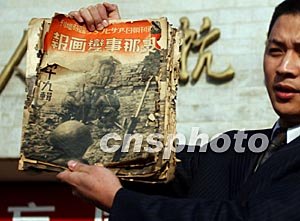 也在今天,幾本揭露當(dāng)年侵華日軍罪行的畫冊(cè)由溫州晚報(bào)社贈(zèng)送給抗戰(zhàn)紀(jì)念館。這家報(bào)社的編輯周麗峰介紹,這幾本發(fā)黃的《支那事變畫報(bào)》系日本朝日新聞社出版,今年十一月被溫州經(jīng)營(yíng)紙盒加工的企業(yè)從進(jìn)口的日本廢紙中發(fā)現(xiàn),畫冊(cè)中報(bào)道了一九三七年以后日軍在北平、天津、漢口、安慶等地的一系列軍事行動(dòng)。