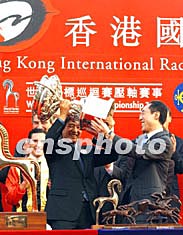 十二月十四日,香港國(guó)際賽馬日在此間沙田馬場(chǎng)舉行,圖為香港財(cái)政司司長(zhǎng)唐英年(右)向榮獲香港杯頭馬、來(lái)自英國(guó)隊(duì)的“飛霸”馬主頒獎(jiǎng)。中新社記者:潘索菲