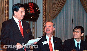 中國人壽董事長(zhǎng)王憲章(左)向紐約證交所董事會(huì)臨時(shí)主席兼首席執(zhí)行官約翰·里德(中)、國壽上市案的全球聯(lián)席協(xié)調(diào)人——中國國際金融有限公司代表朱云來(右)等致辭。
