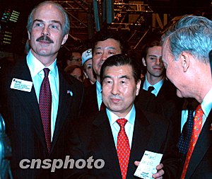 中國人壽董事長(zhǎng)王憲章(中)在紐約證交所董事會(huì)臨時(shí)主席兼首席執(zhí)行官約翰·里德(右)等陪同下,在交易大廳中以首日開盤價(jià)二十三點(diǎn)二五美元,購買了一百股國壽股票。