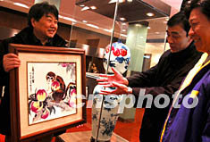 中國工藝美術師、陶瓷專家熊鋼如(左),十二月中旬在北京王府井景德鎮(zhèn)陶瓷城展示他的瓷畫“猴子與桃子”。隨著中國農(nóng)歷猴年的臨近,以猴為形象的工藝品與日俱增。中新社記者:王麗南