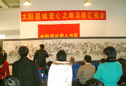太陽星城愛心之旅隨團著名畫家李繁民,傾心力作了八米巨畫《中華五十六駿圖》贈送給香港冠城集團,以表達對企業(yè)支持愛心事業(yè)謝意。石家莊殘聯(lián)理事長王金斗專程從河北趕來,代表石家莊市30萬殘疾人對太陽星城愛心之旅采訪團的奉獻精神表示感謝。在報告會舉行之際,太陽星城愛心之旅所到之處的各級殘聯(lián)、志愿者組織和愛心人士發(fā)來了一百多封賀信。
