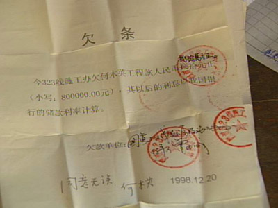 記者計算了一下,僅他們5位手中欠條上的欠款就達300多萬元,涉及到200多個民工的工資。據(jù)調(diào)查,323國道廣東乳源縣城段工程共拖欠民工工資達1300多萬元,涉及施工隊60多個,民工670多人。拖欠時間長達8年多。