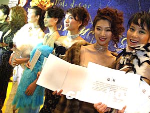 中國(guó)十佳職業(yè)時(shí)裝模特頒獎(jiǎng)儀式二十九日晚在北京舉行,王敏(右一)、劉多(右二)、韋杰、李娟、張?zhí)亍⒍霹N、胥立文、張睿、張迪等中國(guó)模特界精英獲此殊榮。中新社記者:毛建軍