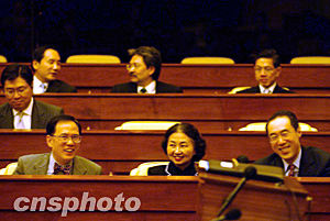 香港政務(wù)司長曾蔭權(quán)、律政司長梁愛詩、財政司長唐英年,1月8日出席立法會旁聽特首董建華答復(fù)議員就施政報告所提出的質(zhì)詢。作者:洪少葵
