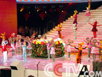 2004年春節(jié)晚會(huì)總導(dǎo)演袁德旺提出以“祝!睘榇和碇黝}!白8!钡闹黝}不僅在舞美設(shè)計(jì)上得到了體現(xiàn),在晚會(huì)現(xiàn)場的一面墻上,還有一塊巨幅的“!弊謭D。44個(gè)由不同的字體書寫的福字環(huán)繞著中間的中央電視臺(tái)的標(biāo)志圖,祝福的主題躍然而出。