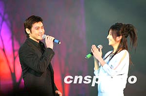 中國600多名藝術(shù)家十一日歡聚北京,在中國文聯(lián)舉辦的《百花迎春--中國文學藝術(shù)界2004春節(jié)大聯(lián)歡》上慶祝即將來臨的新春佳節(jié),演員趙薇、陸毅同臺演唱《好人好夢》。中新社記者:王瑤