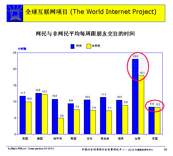 在所有調(diào)查的國(guó)家里,網(wǎng)民平均每周與朋友交往的時(shí)間多于非網(wǎng)民。而只有在美國(guó)和德國(guó),網(wǎng)民和非網(wǎng)民與朋友交往的平均時(shí)間基本是一致的。