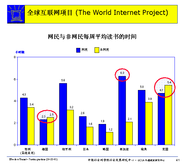 在大多國(guó)家里,網(wǎng)民每周平均讀書時(shí)間多于非網(wǎng)民,德國(guó)和美國(guó)除外。