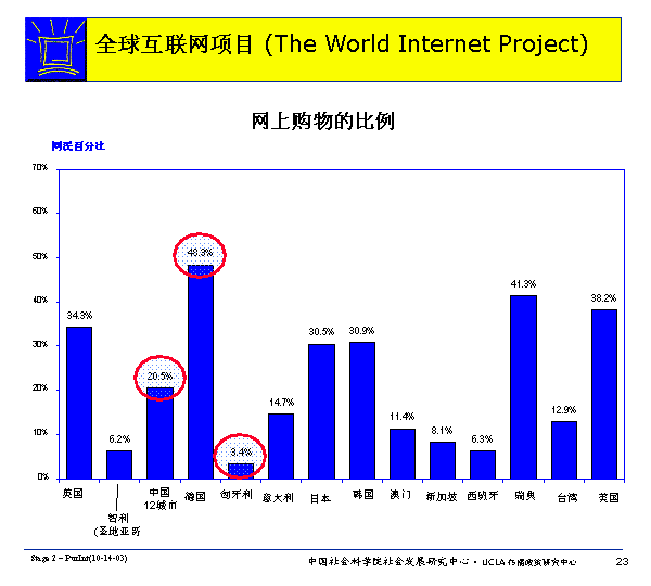 各國網(wǎng)民網(wǎng)上購物的比例各不相同,德國為最高(48.3%),匈牙利為最低(3.4%) 。當(dāng)然,有網(wǎng)上購物經(jīng)驗不等于經(jīng)常上網(wǎng)購物,也不等于在網(wǎng)上花很多錢購物。按照社科院社會發(fā)展研究中心的數(shù)據(jù),中國網(wǎng)民上網(wǎng)購物的頻次和網(wǎng)上購物支出的錢數(shù)都是相對比較低的。