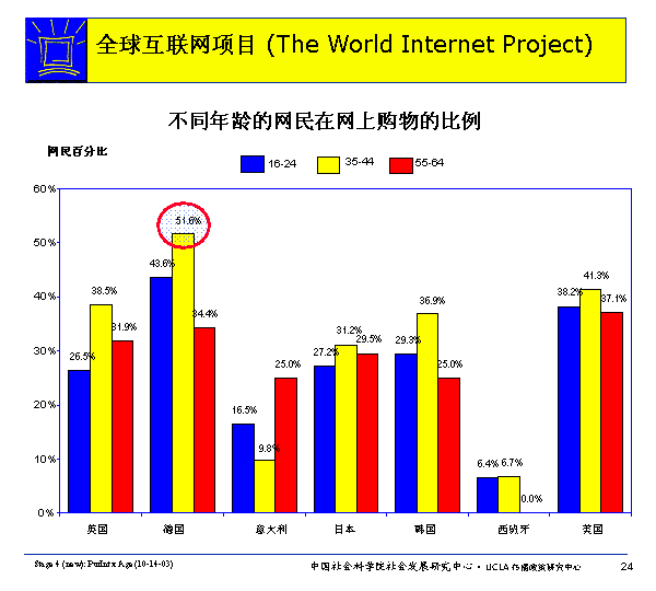 除意大利外,通常中年人更愿意在網(wǎng)上購物。所有國家35-44歲之間的網(wǎng)民比16-24歲或55-64歲之間的網(wǎng)民更可能上網(wǎng)購物。