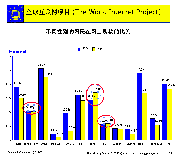 在除韓國和澳門以外的所有WIP國家里,男性比女性更可能網(wǎng)上購物。