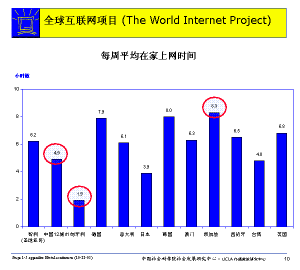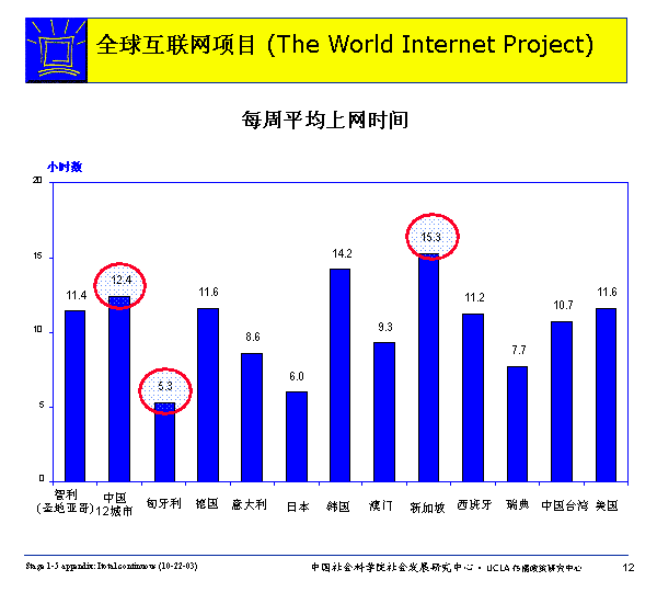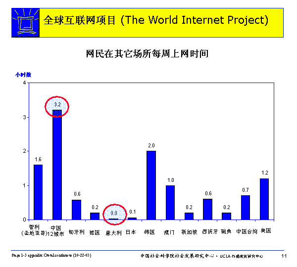 網(wǎng)民每周在家庭、辦公室或?qū)W校之外的場(chǎng)所(在發(fā)達(dá)國(guó)家,有可能是在圖書館,而一般國(guó)家則更可能是在網(wǎng)吧)上網(wǎng)的平均時(shí)間多者可達(dá)3.2小時(shí)(中國(guó)),少則幾乎為零(意大利)。