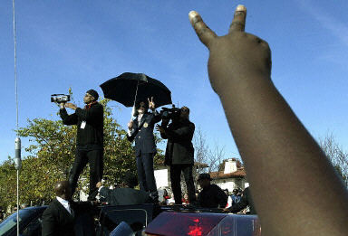 杰克遜在走到法庭建筑前時(shí)與一些歌迷握手并交談。不少歌迷已在那里等候了12個(gè)小時(shí)之久。