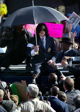 杰克遜在抵達(dá)加州圣瑪麗亞法庭時(shí)受到一群手持歡迎標(biāo)語(yǔ)牌和支持條幅的歌迷的歡迎。當(dāng)杰克遜從汽車?yán)镒叱鰜?lái)時(shí),等候在那里的他的一些歌迷哭了起來(lái),并唱起了歌,一些人揮動(dòng)手中的聲稱“杰克遜是無(wú)辜的”支持標(biāo)語(yǔ)。