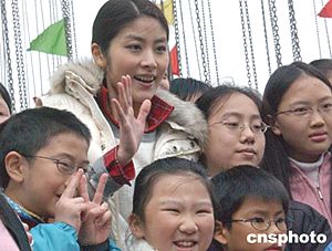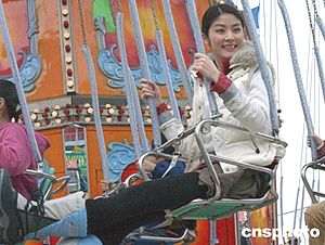 香港歌星陳慧琳元月十七日參加正在添馬艦廣場舉行的環(huán)球嘉年華活動,為“空中秋千”機動游戲擔任操作員并與小朋友一起蕩秋千。作者:錢興強