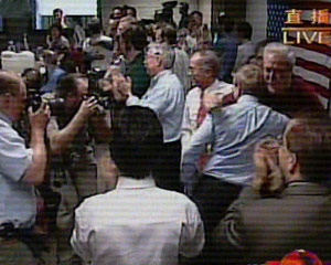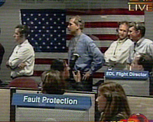 美國(guó)宇航局(NASA)宣布,美國(guó)“機(jī)遇”號(hào)火星探測(cè)器于格林尼治時(shí)間25日5:05分(北京時(shí)間13:05時(shí))成功在火星表面登陸。(以上均為電視截圖)