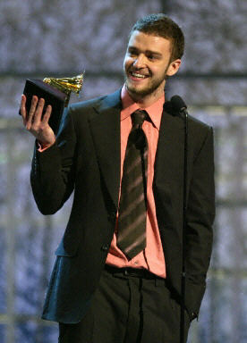 第46屆格萊美頒獎(jiǎng)典禮今天在美國(guó)洛杉磯Staples中心舉行。圖為著名歌手賈斯汀(Justin Timberlake)獲最佳流行男歌手獎(jiǎng)。
