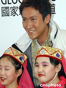 香港藝員馬德鐘二月十七日出席在香港舉行的“馬可波羅現(xiàn)代東游記”攝影展開幕式,與表演新疆舞的小朋友一起拍照。作者:錢興強(qiáng)