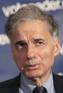本周即將年滿(mǎn)七十的納德二000年曾經(jīng)以綠黨候選人的身份參與總統(tǒng)大選角逐,雖然僅獲得百分之二點(diǎn)七的選票,但因?yàn)椴际苍诜鹆_里達(dá)和新罕布什爾兩州僅以微弱的優(yōu)勢(shì)壓倒戈?duì),取得這兩州的選舉人票而登上總統(tǒng)寶座,民主黨人認(rèn)為納德的得票分流了本來(lái)支持戈?duì)柕倪x民,導(dǎo)致戈?duì)柭鋽 ?div align="left">