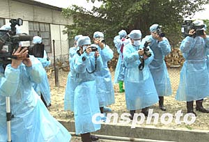澳門特區(qū)民政總署和珠海出入境檢驗檢疫局一日在珠海舉行會議,就恢復(fù)因禽流感而中斷的活雞輸入問題進(jìn)行協(xié)商并達(dá)成共識,雙方?jīng)Q定報國家有關(guān)部門批準(zhǔn)后,從三月五日起同步恢復(fù)活雞、冰鮮雞、和凍雞的供應(yīng)。圖為前往珠海養(yǎng)雞場采訪的眾媒體記者們?yōu)榇_保雞只的健康,也不得不穿上隔離防護(hù)服工作。作者:李剛